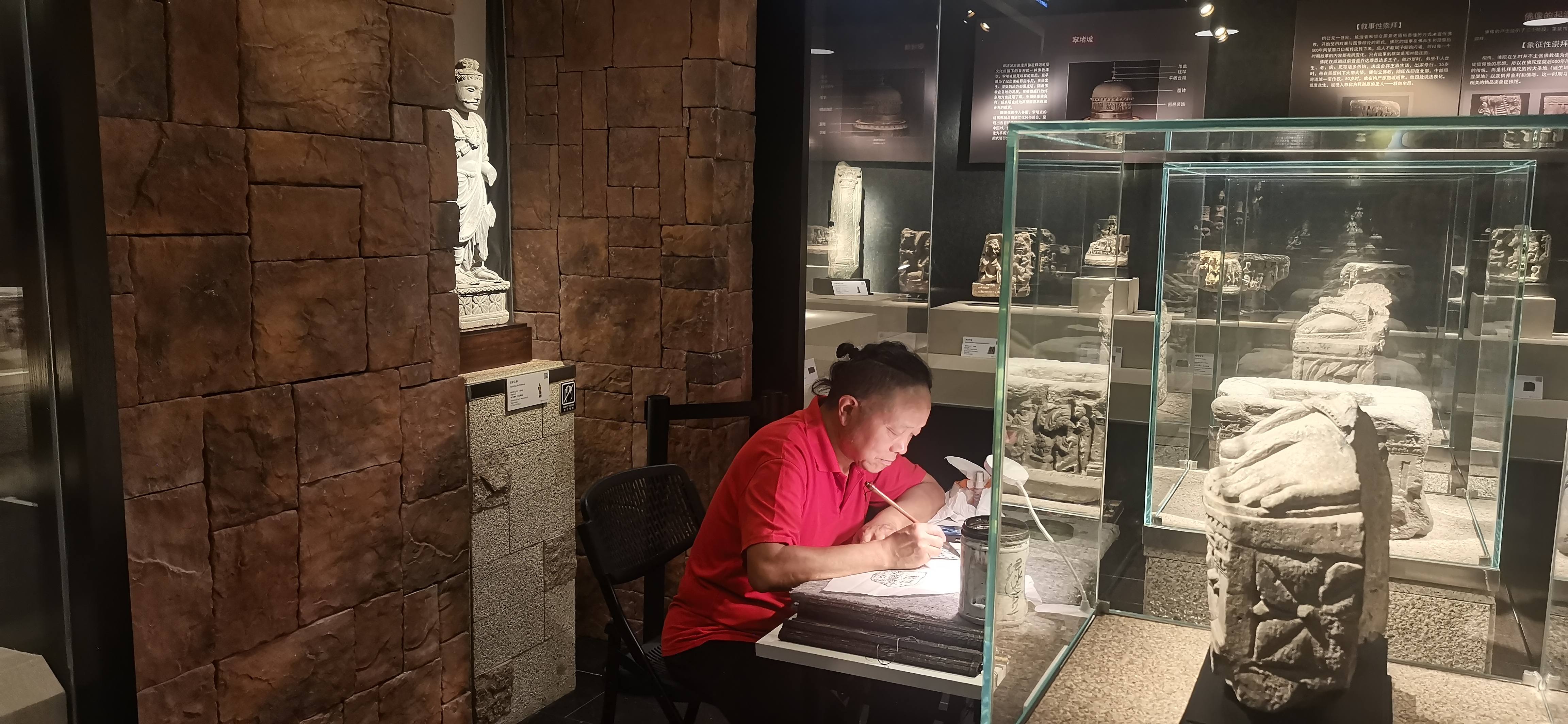 在梵亚的两日,王立庆的创作始终围绕馆藏犍陀罗主题浮雕展开。面对那些融合了希腊雕塑肌体美感与古印度佛教精神的造像,他时而凝神端详,时而挥毫点染——墨色皴擦处,佛陀垂目沉思的面容渐次清晰;淡彩晕染间,菩萨衣袂飘举的动态呼之欲出……